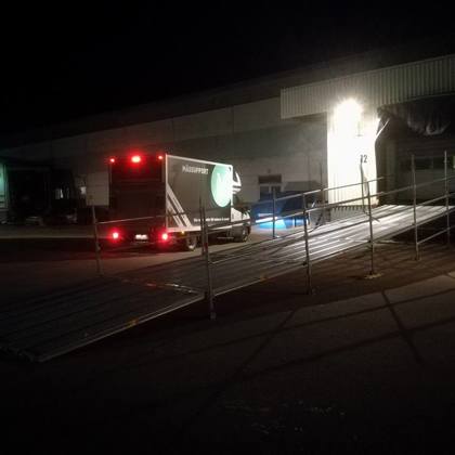 Bilden visar en entrélösning till ett event som var i en vanlig lagerlokal och då det var mycket folk som på kort tid skulle ta sig in och ut så nyttjades en vanlig lastbilsport... Tilläggas ska även göras att Brandmyndigheten hade som krav att de få som var rullstolsbundna också måste ha en flyktväg ut och då fick inte rampen vara för brant och därav blev den 18m lång.