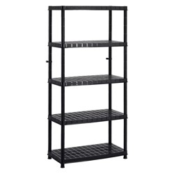 En hylla av plast med 5 hyllplan, går att montera ner vid frakt. Önskas en lägre hylla kan man montera färre hyllplan.