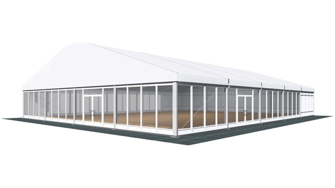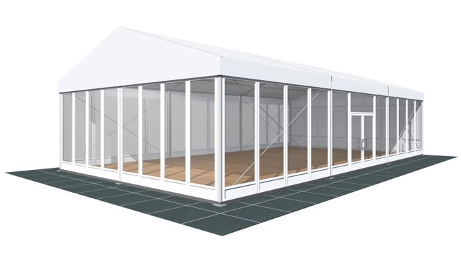 Detta tält levereras med mjuka brandklassade PVC dukar eller med glasväggar med en höjd på tre meter och dubbeldörrar med glaspartier. Taktoppen i mjuk vit PVC landar på över sju meter.